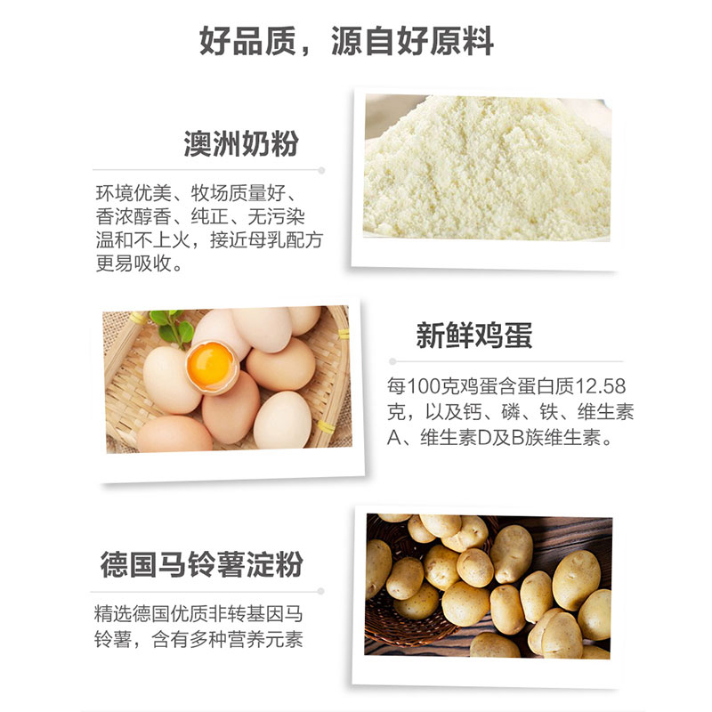 食用馬鈴薯粉、白砂糖、雞蛋、乳粉、麥芽糖等