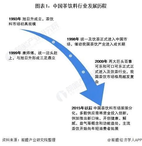 1993年旭日升系列茶飲橫空出世,拉開了我國茶飲料行業的序幕,距今,茶飲料在我國已發展了27年。從茶飲料的發展歷程來看,我國茶飲料市場經歷了幾個重要的發展節點: